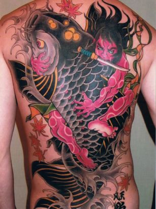 A Full Back Tattoos Design With Koi Fish And A Man Catch The Koi Fish.