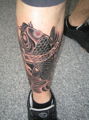 A Black Koi Fish Tattoo Design Inked On Leg.