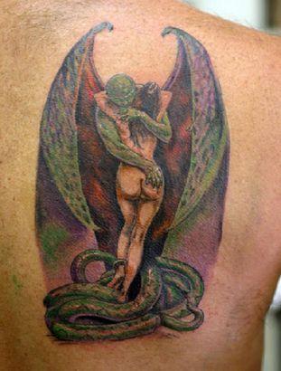 Demon And Girl Tattoo Design On Right Shoulder Blade.